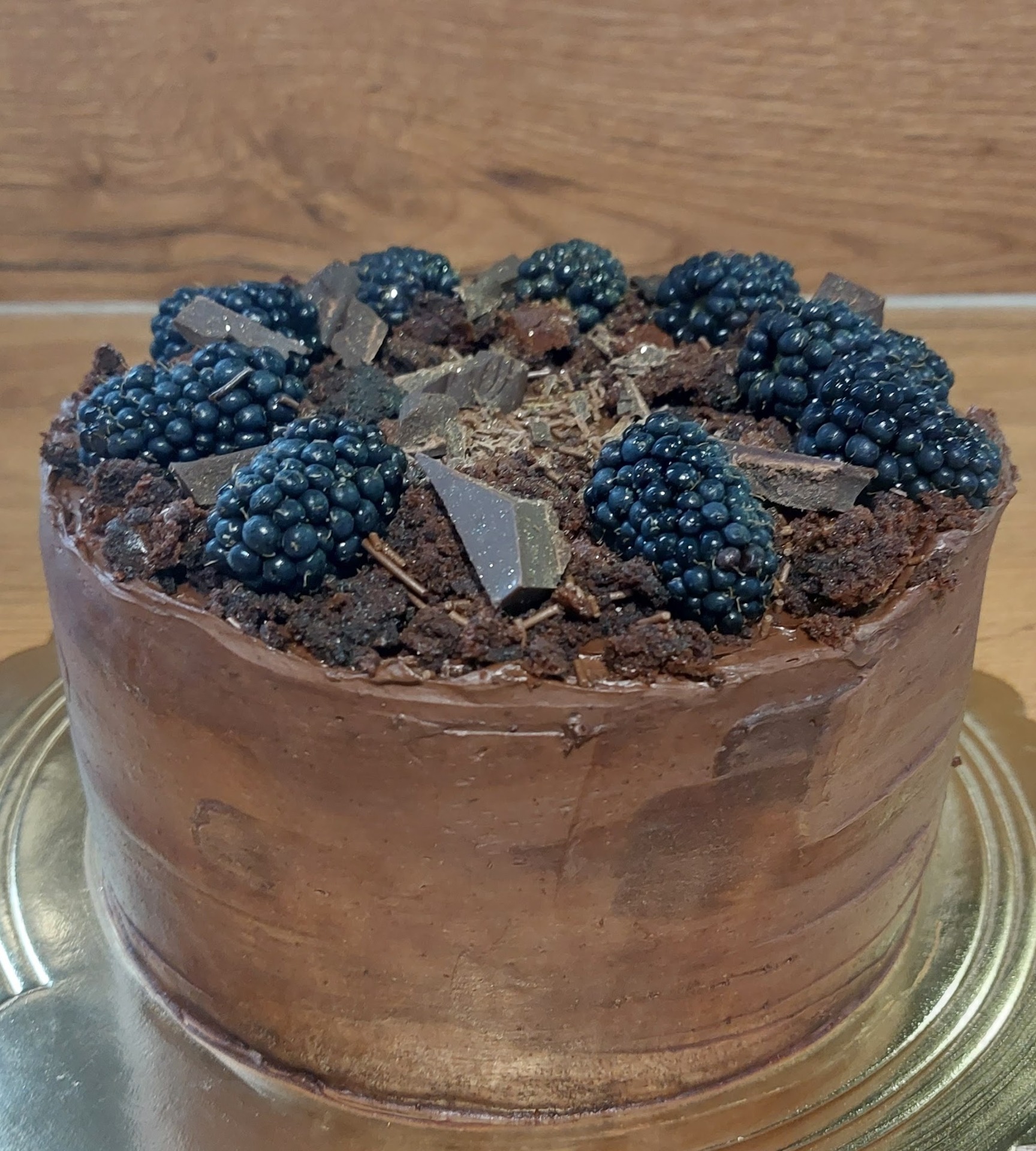 Vláčný čokoládový korpus, ganache z tmavé čokolády, mascarpone nutelový krém, ostružiny