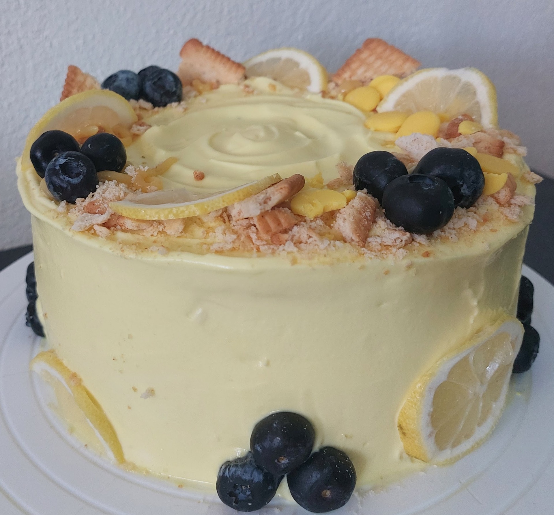 Vanilkový piškot, citrónový krém s bílou čkoládou, lemon curd borůvkový mousse, borůvky