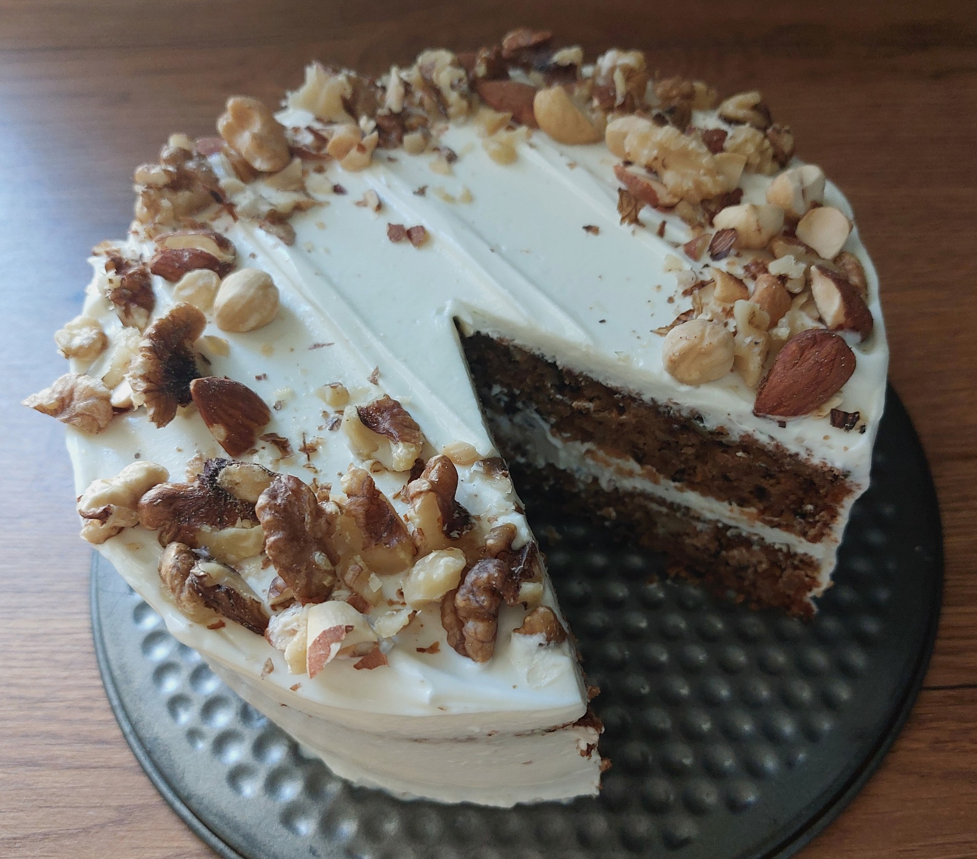 Kořeněný mrkvovo - ořechový korpus, tvarohovo - smetanový krém, pražené oříšky, domácí slaný karamel.