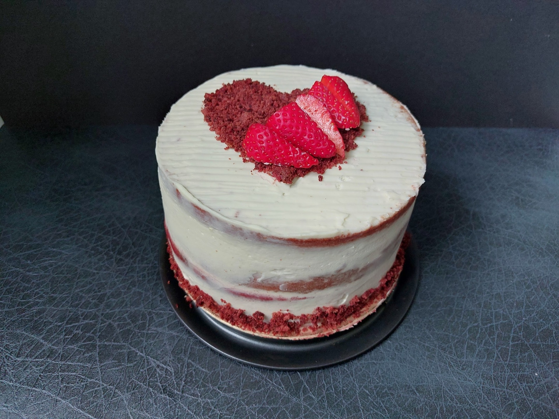 Tradiční Red Velvet se smetanovým krémem a jahodami.