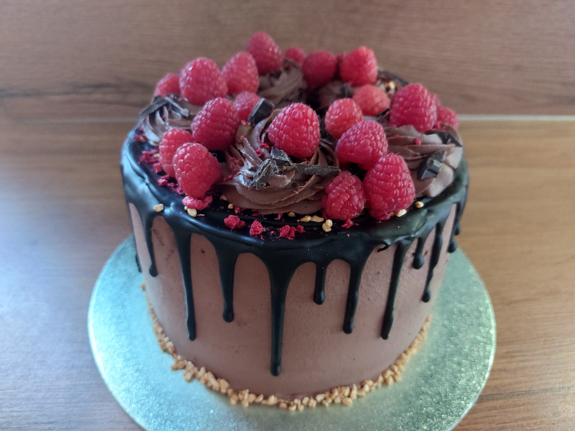Vláčný čokoládový korpus, Malinový krém s bílou čokoládou, malinový rozvar, pařížská šlehačka